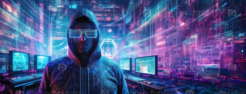 Фигура стоит в освещенной неоновым светом киберкомнате, намекая на высокотехнологичное наблюдение. Силуэт человека контрастирует с цифровыми экранами, отражая футуристический шпионаж