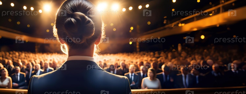 Женщина на сцене перед публикой в большом зале под ярким светом прожектора