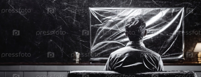 Мужчина сидит перед искаженным экраном в темной комнате, создавая атмосферу изоляции, раздумий или антиутопии