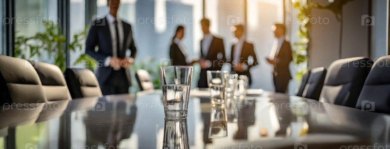Стакан воды на отражающем столе для переговоров с людьми в деловых костюмах на заднем плане