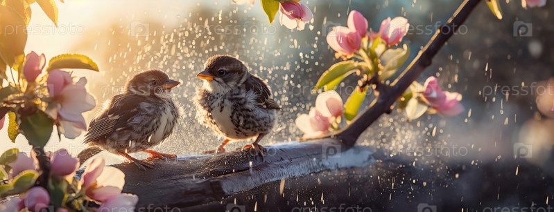 Воробьи сидят на ветке во время легкого ливня, капли дождя сверкают в мягком свете. Пернатые друзья разделяют момент безмятежности среди весенних цветов, симфонии природы