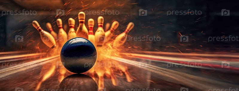 Динамичная сцена, где шар для боулинга с взрывной энергией ударяет по кеглям