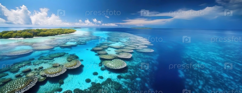 День Австралии отражает дух земли внизу, знаковые достопримечательности и природные чудеса. Панорамный вид сверху на Большой Барьерный риф, коралловые атоллы и бирюзовые воды морской жемчужины Австралии