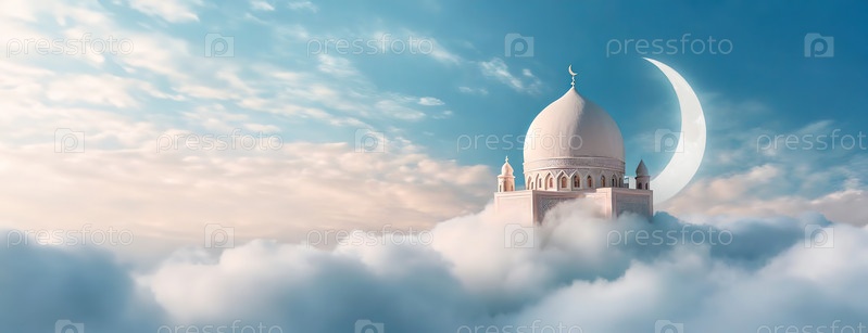 Фон праздника Ид аль-Фитр или Рамадан. Мечеть возвышается над облаками с полумесяцем. Мир и духовность, с небом, простирающимся в бесконечность. Панорама с копировальным пространством