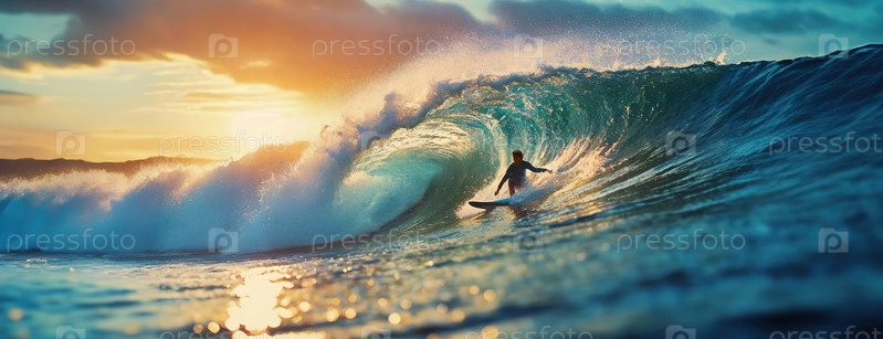 Серфер скользит по большой волне во время заката на фоне сияющего солнца