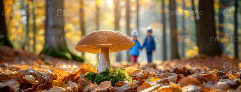 Большой гриб на лесной подстилке, покрытой осенними листьями, на заднем плане — двое детей, держащихся за руки
