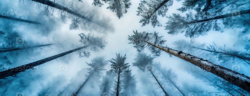 Взгляд на туманный лес с высокими тонкими деревьями, тянущимися к туманному небу, создающими неземную атмосферу