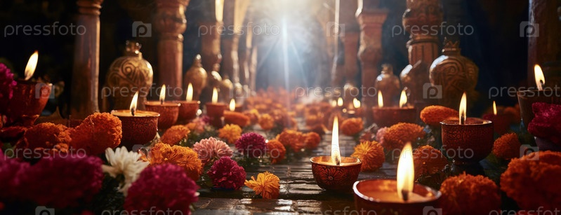 Зажженные свечи и цветы бархатцев, расставленные для праздничного празднования фестиваля Дивали