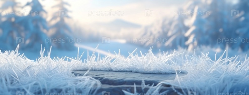 Морозный зимний пейзаж с ледяными кристаллами на земле на фоне заснеженного леса с елями и мягким утренним светом