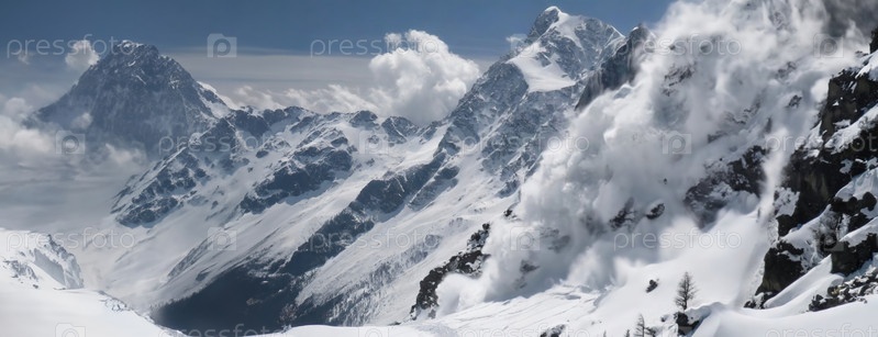 Заснеженные горы и сход лавины на фоне зимнего пейзажа