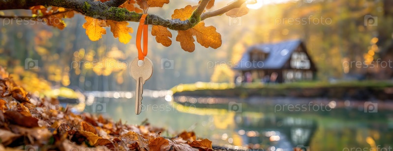 Ключ висит на ветке дерева с осенними листьями, на заднем плане размытый дом на берегу озера, символизирующий дом, собственность или новое начало