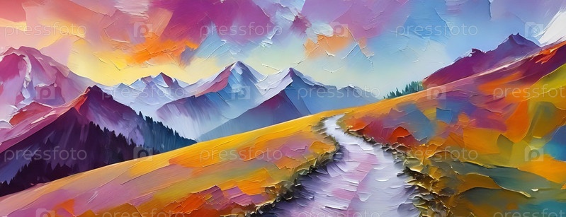 Абстрактный горный пейзаж с красочной тропой, вьющейся через яркую импрессионистскую сцену
