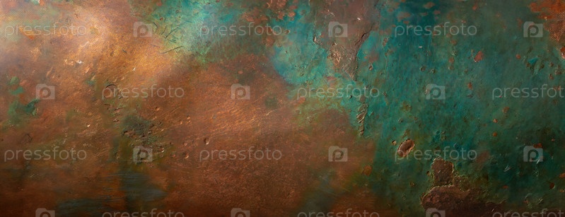 Детализированная поверхность из грубого металла с оксидацией, создающая землистую смесь медных и зеленых тонов, отражающую течение времени