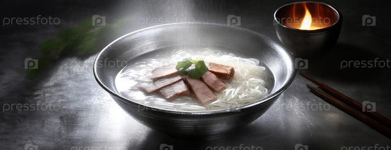 Дымящаяся миска с рисовой лапшой, ломтиками мяса и свежей зеленью, поставленная на темный, мрачный фон рядом с зажженной свечой, создает уютную атмосферу