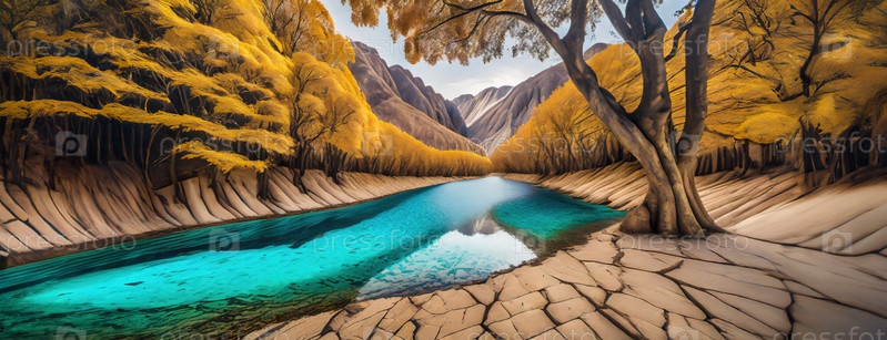 Спокойная река в окружении деревьев с желтыми осенними листьями, яркие цвета которых отражаются в ее спокойных чистых водах в уединенной долине