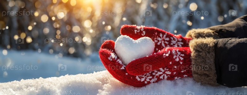 Снежный ком в форме сердца в красных перчатках на фоне заснеженного леса на рассвете. Фон ко Дню святого Валентина