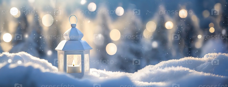 Светящийся фонарь в снегу с сумеречным лесом и сверкающими огнями боке, создающими праздничную сцену. Мягкий свет свечи на снежном пейзаже