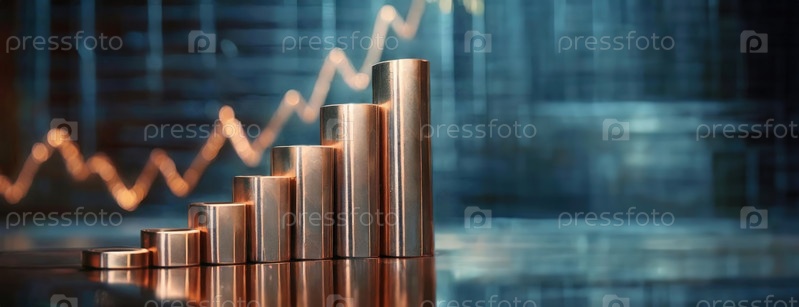 Медные цилиндры увеличиваются в размерах на фоне светящихся линий рыночных трендов, указывающих на рост. Это металлическое представление символизирует взлеты и падения торговли сырьевыми товарами