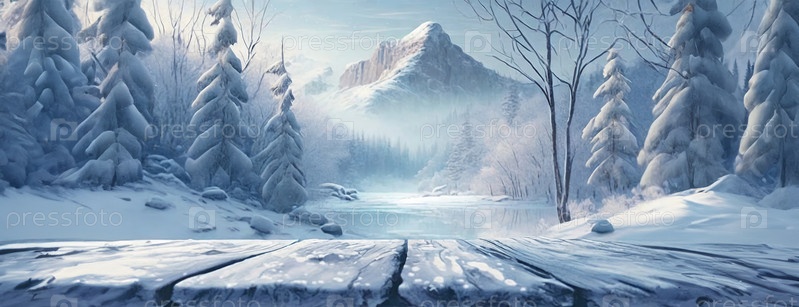 Фон зимней сказки. Безмятежная красота заснеженного лесного пейзажа у кристально чистой реки. Холодное великолепие. Панорама с копировальным пространством