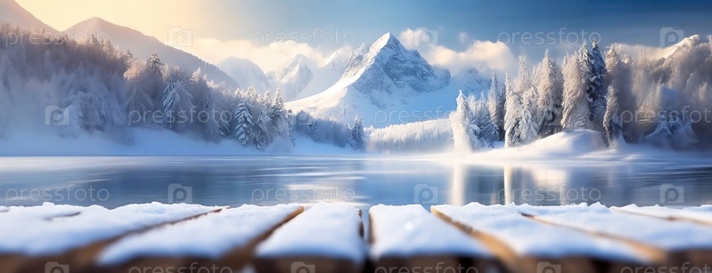 Спокойная зимняя сцена разворачивается на деревянной террасе, ведущей к замерзшему озеру, на фоне заснеженных гор, залитых мягким солнечным светом