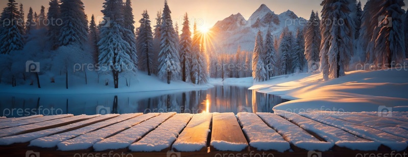 Пустой деревянный фон столешницы с бесплатным местом для копирования. Солнечный пейзаж в снежном зимнем горном озере. Абстрактный сосновый лес в свете заката. Панорама с местом для копирования