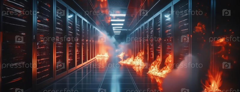 Пожар в проходе центра обработки данных: из серверных стоек поднимаются языки пламени и дым