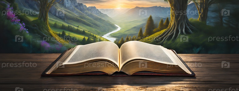 Открытая книга на деревянном столе с захватывающим видом на горную долину, разворачивающимся за ней, смешивающая реальность и фантазию в одном кадре