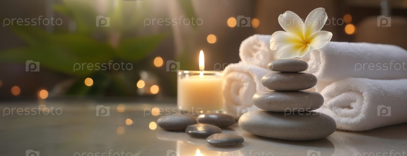 Спа-камни и цветок плюмерии со свечой создают спокойную обстановку для релаксации и ухода за собой
