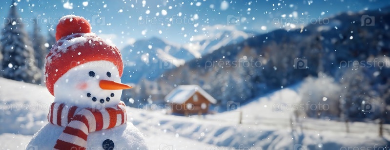 Веселый снеговик на фоне заснеженного пейзажа с уютной хижиной на заднем плане, создающий атмосферу зимней сказки