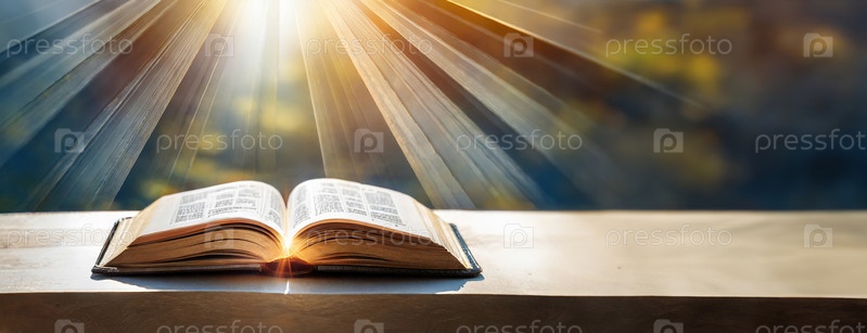Открытая книга, освещенная божественными лучами, на фоне размытого леса, символизирующая просветление и духовность