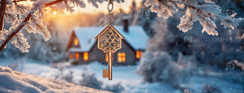 Ключ с изображением дома, висящий на замерзшей ветке с уютной хижиной на заднем плане. Современная загородная частная вилла с зимним снежным фоном. Недвижимость, переезд или аренда недвижимости