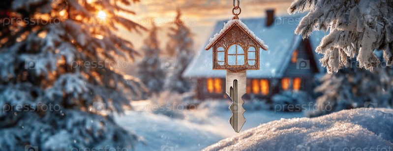 Ключ в форме дома, висящего на ветке дерева зимой, символизирующий владение домом и зимнее тепло. Концепция недвижимости, покупки или аренды недвижимости