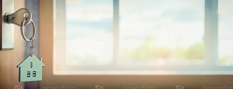 Ключ от дома в двери с размытым фоном солнечной комнаты. Концепция недвижимости, переезда или аренды недвижимости
