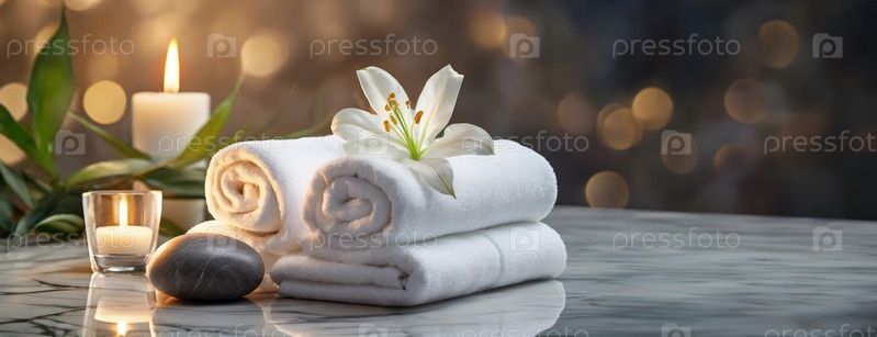 Аккуратно сложенная пара полотенец с цветком лилии наверху, свечи на заднем плане. Панорамное пространство для копирования