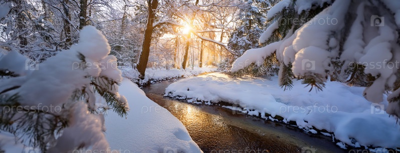 Тихий зимний ручей, протекающий через лес, покрытый снегом, и золотистый солнечный свет, пробивающийся сквозь деревья