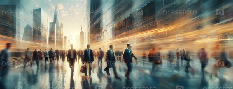 Бизнесмены прогуливаются по динамичной современной городской среде, размытость изображения передает суету городской жизни