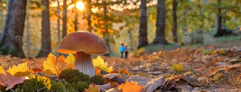 Крупный план гриба в лесу осенью, окруженного опавшими листьями, с солнечным светом, пробивающимся сквозь деревья на заднем плане, запечатлевшим безмятежный и волшебный момент. Двое идут