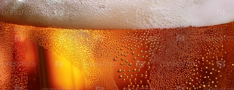 Пенистое пиво с пузырьками, поднимающимися на поверхность, и янтарной жидкостью, которая в мельчайших деталях отражает свет