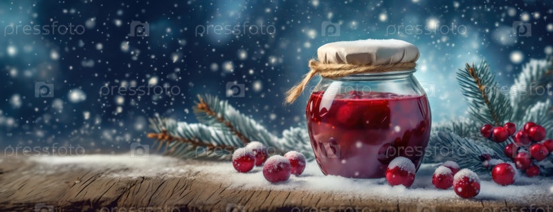 Праздничная банка клюквы на снежном фоне. Стакан варенья, перевязанный деревенским бантом из бечевки, стоит на снегу с ягодами и сосновыми ветками, вызывая уютный дух. Панорама с местом для копирования