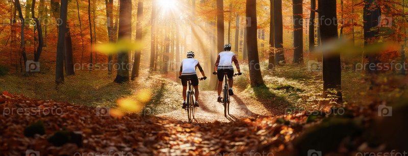 Два велосипедиста едут по залитому солнцем осеннему лесу с яркими осенними красками