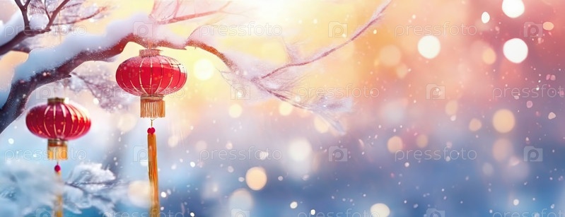 Зимний праздник: китайские фонарики среди заснеженных ветвей. Китайский Новый год. Панорама с копировальным пространством, минималистичный фон