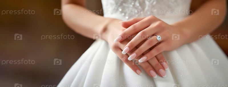 Элегантное обручальное кольцо на пальце невесты. Крупный план демонстрирует сверкающий бриллиант на нежном ободке, платье невесты служит мягким фоном. Панорама с местом для копирования