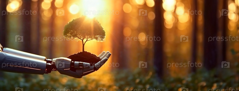 Роботизированная рука держит молодое дерево на закате. Концепция Дня Земли и Дня посадки деревьев. Металлическая роботизированная рука бережно держит саженец на фоне леса. Панорама с копировальным пространством