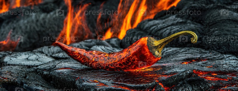 Перец чили лежит на раскаленных углях, вулканической лаве. Яркий красный цвет перца ярко выделяется на темной, потрескавшейся поверхности, вызывая ощущение сильного жара и жгучего вкуса специи