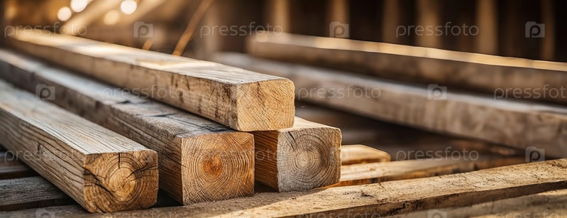 Сложенные пиломатериалы в фокусе с размытым фоном, намекающим на стабильность строительного рынка. Панорама с копировальным пространством