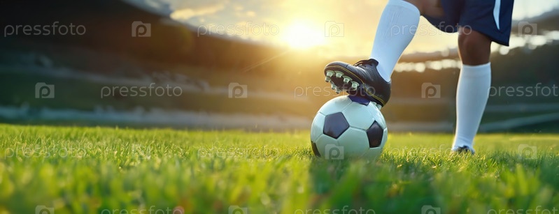 Футболист контролирует мяч на поле во время матча на фоне сияющих огней стадиона