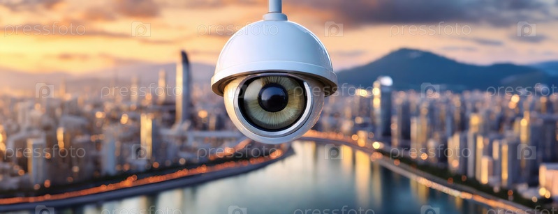 Камера видеонаблюдения с панорамным видом на оживленный мегаполис. Бдительный страж обеспечивает наблюдение за городским пространством. Панорама с копировальным пространством