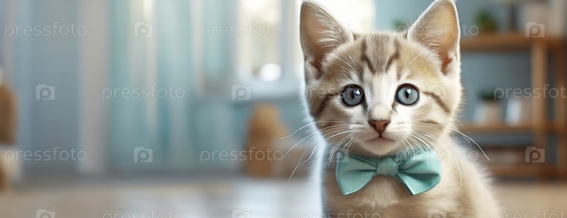 Очаровательный котенок с яркими голубыми глазами в галстуке-бабочке ждет своего хозяина. Питомец — лучший подарок на праздник для детей. Панорама с местом для копирования