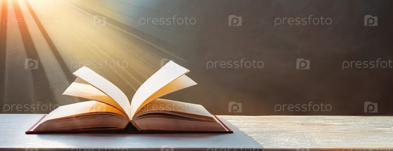 Открытая книга в твердом переплете на столе, со страниц которой струится солнечный свет, создавая теплую, уютную атмосферу