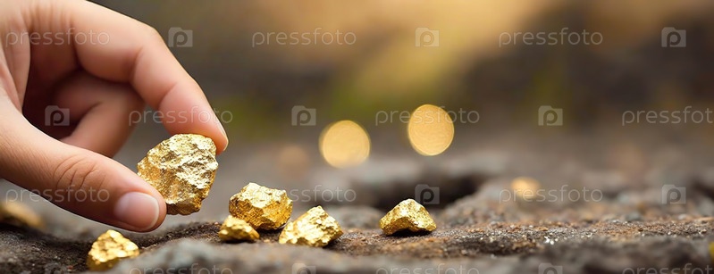 Рука подбирает золотой самородок среди других на земле, с мягким фокусом на заднем плане. Панорама с копировальным пространством